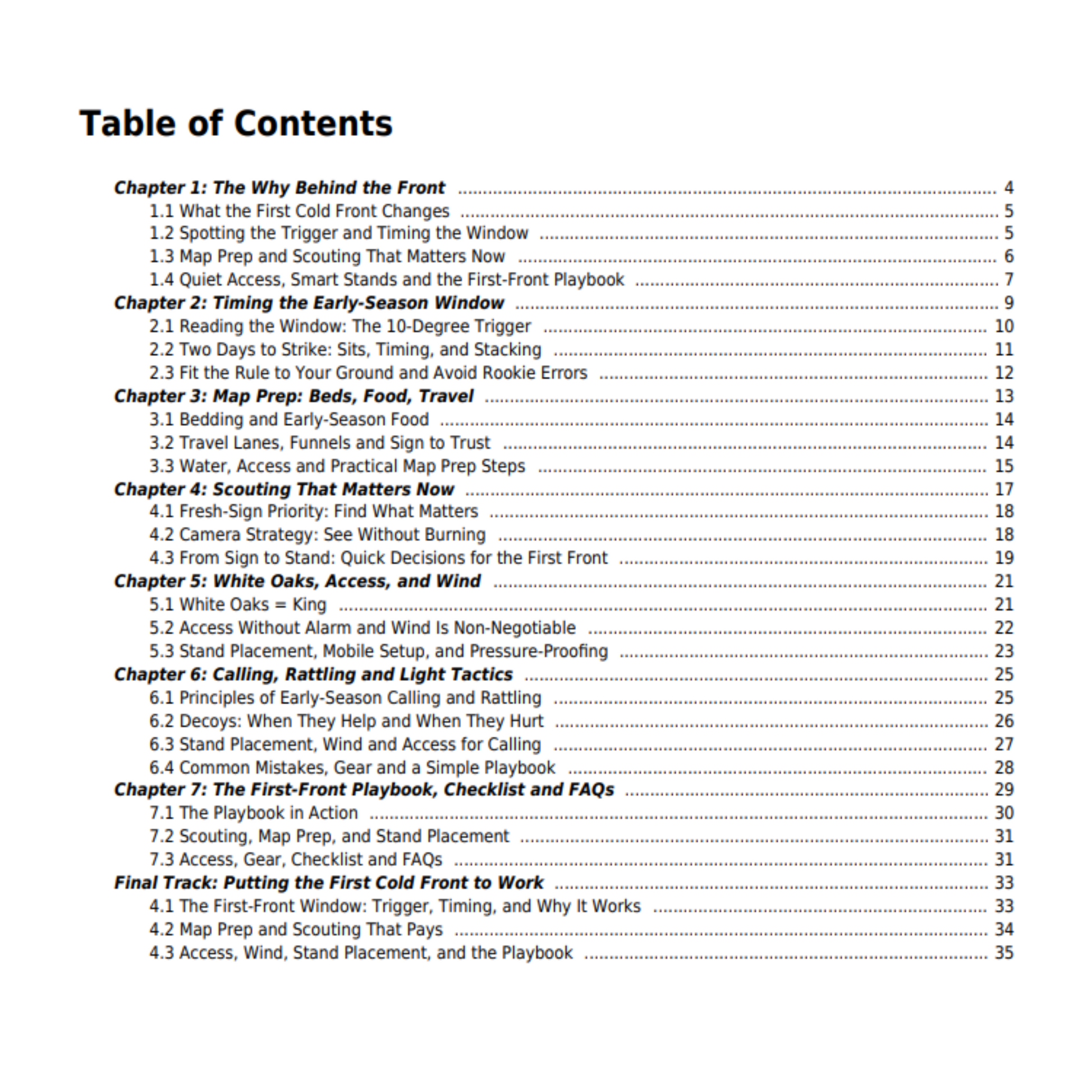Beat the heat and hunt smarter the moment the weather flips. In this concise field guide, Kayla Monroe shows you exactly how to capitalize on the first real cold front—from spotting the ~10° trigger to stacking the 48-hour “two-day strike” window for daylight movement. You’ll get map-prep checklists, quiet access plans, and stand setups that match wind, food, and bedding—plus light, believable calling tactics that won’t burn your spot.