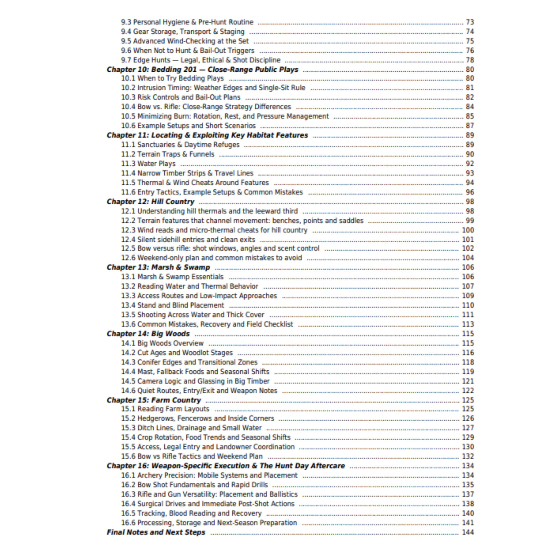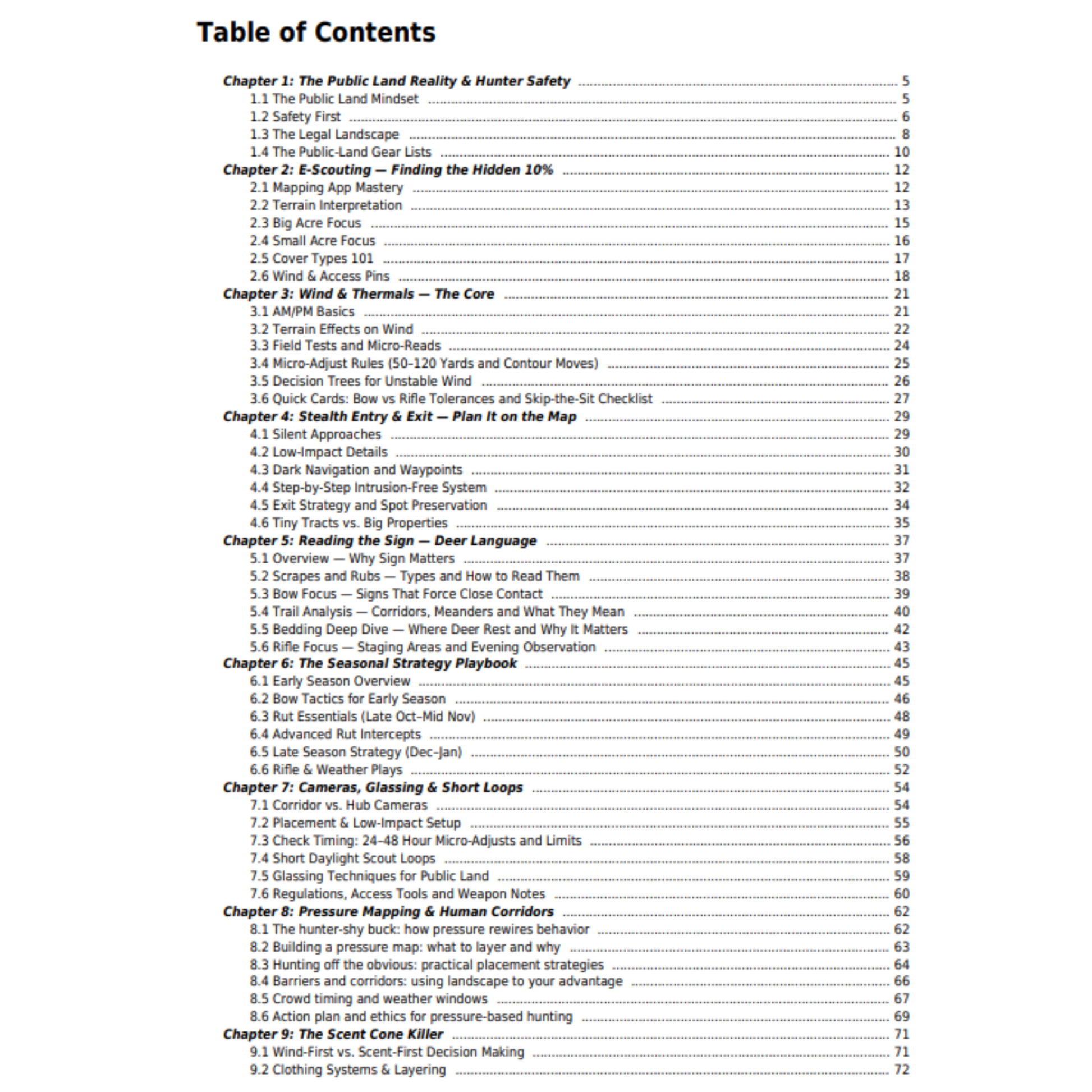 - Season Plans: early food plays, rut funnels & all-day sits, late-season thermal cover + calories.